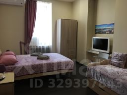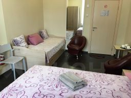 В номере находятся двуспальная кровать, односпальная кровать, шкаф, две тумбочки, журнальный столик с двумя креслами, зеркало, ТВ, мини холодильник, чайник, фен. Уютный, теплый, светлый номер. Красивый вид из окна на ул.Светланская.