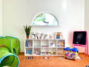 - Берите с собой детей, им тоже будет интересно: детская игровая на первом этаже с игрушками для любого возраста, раскрасками и поделками. А на улице их ждёт детская площадка с качелями, горкой, маленьким домиком и песочницей.