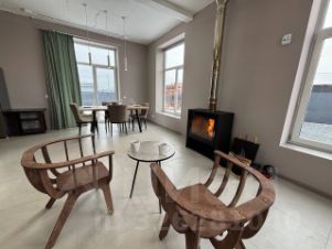Просторная кухня-гостиная с диваном и большим камином, для тёплых и уютных вечеров в кругу своих близких.