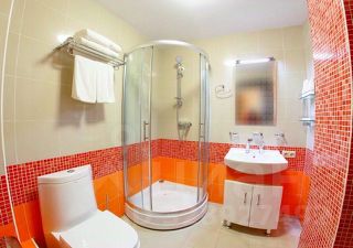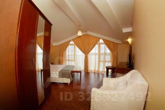 Четыре двухместных комнаты на втором этаже (в каждой санузел): 2 односпальные кровати или 1 двуспальная, 2 прикроватные тумбы с бра, прикроватная скамья, багажная тумба, телевизор, стол, зеркало, плательный шкаф, кресло, круглый кофейный столик, отдельные санузлы (2 с душевыми кабинами и 2 с ванными).