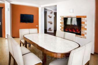 Оборудование зала на первом этаже: комплект мягкой мебели, электрокамин, журнальный столик, телевизор.