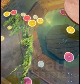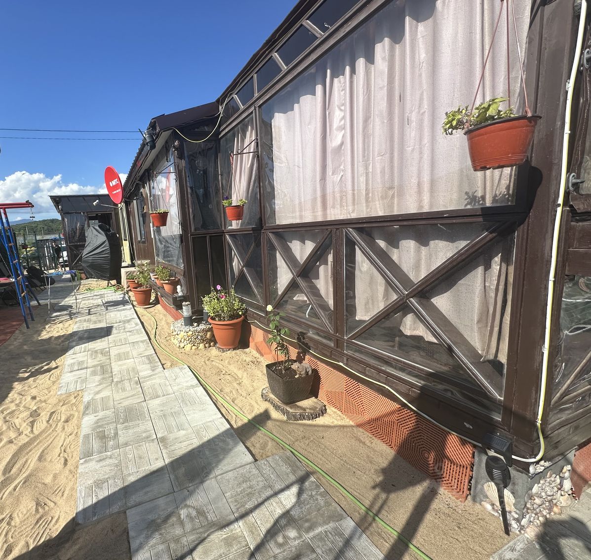 -батут выдерживает до 300кг и детский спортивный. Есть банный чан с видом на море на 8 человек и беседка с газовым камином. Установлен теплый кабель для двух домов.По периметру снимают 4 видеокамеры,Wi-Fi,спутниковое телевидение.