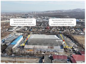 Площадь: 11072,9 кв.м. с возможностью увеличения площади до 13 424,9 кв.м. (+ 2352 кв.м.) при возведении стеновых панелей крытых разгрузочных рамп.