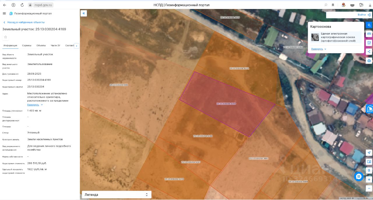 Земельный участок общей площадью 1403 кв.м., кадастровый номер 25:13:030204:4169.Местоположение: установлено относительно ориентира, расположенного за пределами участка. Ориентир здание. Участок находится примерно в 170 метрах по направлению на юг от ориентира. Почтовый адрес ориентира: Российская Федерация, Приморский край, Партизанский муниципальный округ, пос. Волчанец, ул. Шоссейная, д.1а. Категория земель: земли населенных пунктов. Вид разрешенного использования: для ведения личного подсобного хозяйства.Земельный участок расположен в зоне с особыми условиями использования территории: - реестровый номер границы: 25:00-6.323 часть водоохранной зоны Японского моря.