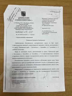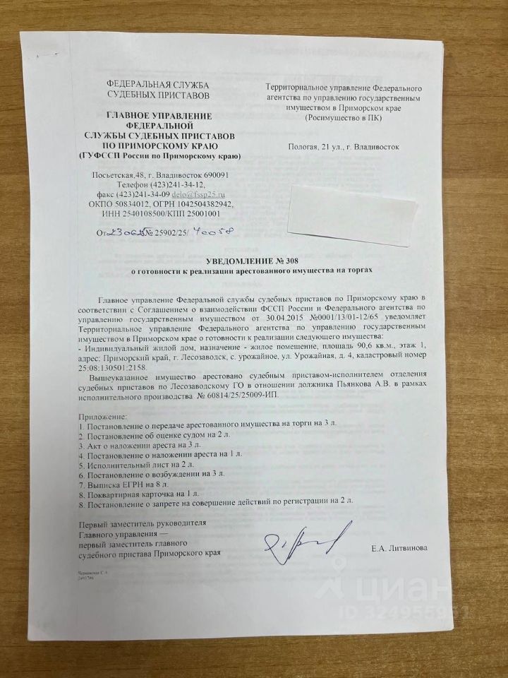 Индивидуальный жилой дом с кадастровым номером 25:08:130501:2158, расположенный по адресу: Приморский край, г. Лесозаводск, с. Урожайное, ул. Урожайная, д. 4, площадью 90,6 кв.м., вид права: собственность, ограничение (обременение): три записи о запрещении регистрации, обременен залогом по договору от 27.10.2023, назначение - жилой дом, этаж один, зарегистрировано два человека. Земельный участок не зарегистрирован и не сформирован, у собственника индивидуального жилого дома имеется исключительное право на приобретение земельного участка.
