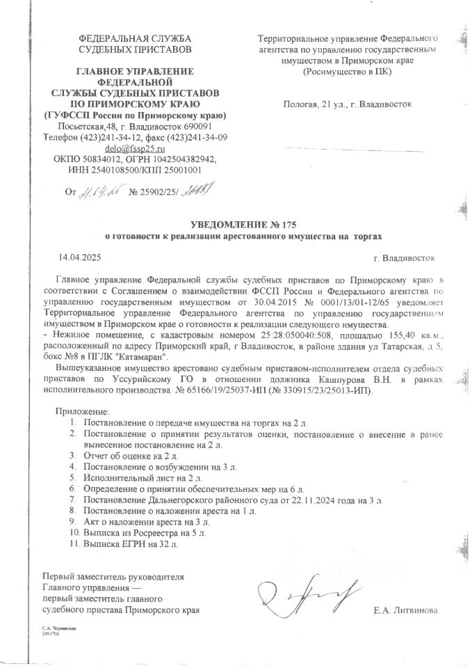 Нежилое помещение (гаражный бокс) площадью 155,40 кв.м., кадастровый номер 25:28:050040:508, расположенное по адресу: Приморский край, г. Владивосток, в районе здания ул. Татарская, д. 5, бокс 8 в ПГЛК "Катамаран", 3 этажа, 1 этаж красный кирпич, 2,3 этаж бело-серая отделка, вид права - собственность, сведения о правах и ограничениях (обременениях): 8 записей о запрещении регистрации, 2 записи арест, 2 записи о прочих ограничениях прав и обременениях объекта недвижимости.