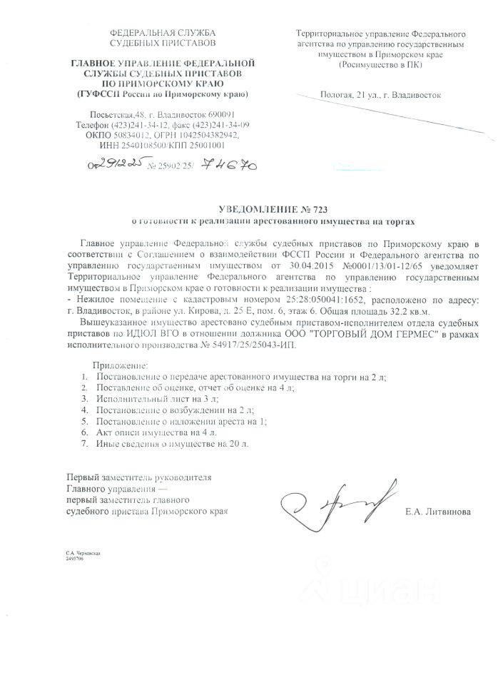 Нежилое помещение площадью 32,2 кв.м., кадастровый номер 25:28:050041:1652, расположенное по адресу: Приморский край, г. Владивосток, в районе ул. Кирова, д. 25Е, пом. 6, этаж. 6, вид права - собственность, сведения о правах и ограничениях (обременениях): 2 записи о запрещении регистрации.