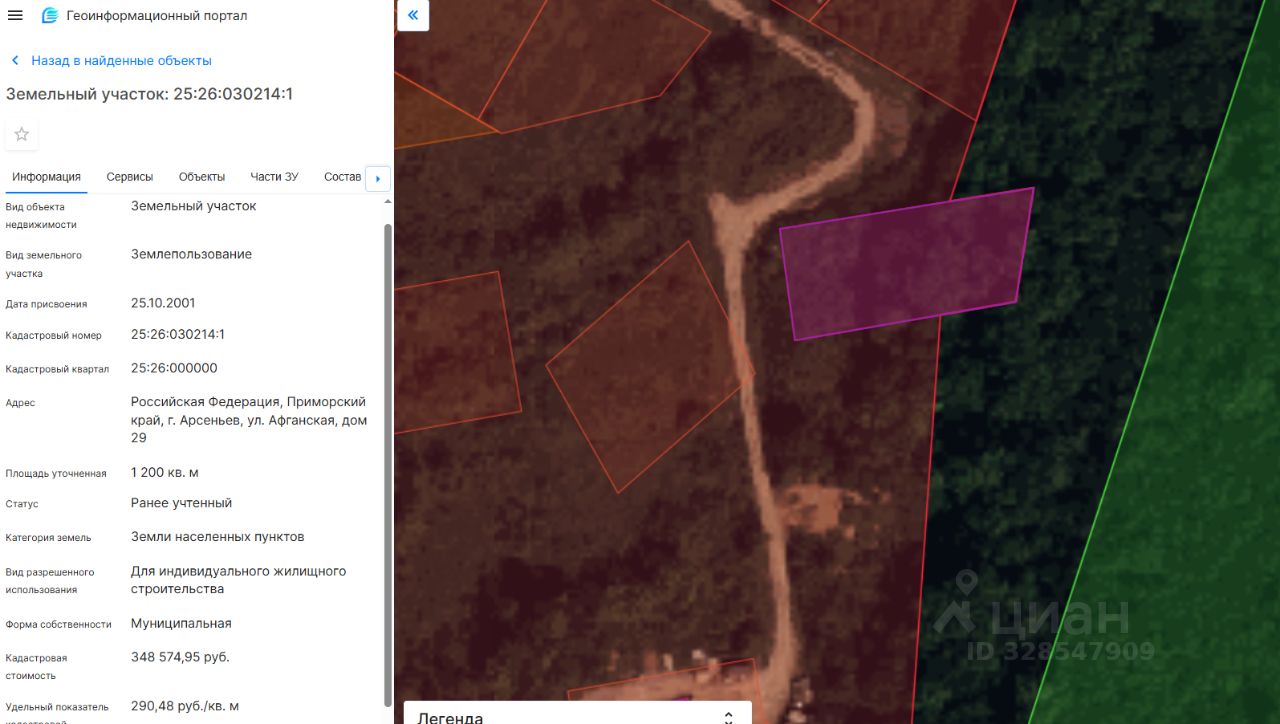 Земельный участок с кадастровым номером 25:26:030214:1 площадью 1200 по адресу Приморский край, г. Арсеньев, ул. Афганская, дом 29