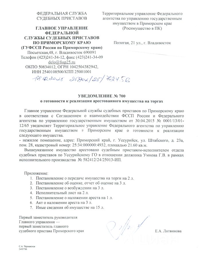 Нежилое помещение площадью 21,6 кв.м., кадастровый номер 25:34:000000:4932, расположенное по адресу: Приморский край, г. Уссурийск, ул. Штабского, д. 23А, пом. 28, вид права - собственность, сведения о правах и ограничениях (обременениях): 2 записи о запрещении регистрации, арест.