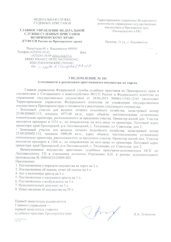 Земельный участок площадью 5000 кв.м. с кадастровым номером 25:08:020602:112, местоположение установлено относительно ориентира, расположенного за пределами участка. Ориентир жилой дом. Участок находится примерно в 1268 м по направлению на юго-запад от ориентира. Почтовый адрес ориентира: Приморский край, Лесозаводский район, с. Тихменево, ул. Советская, дом 2. Вид права: собственность, категория земель: земли сельскохозяйственного назначения, вид разрешенного использования: для ведения личного подсобного хозяйства, ограничение прав и обременение объекта недвижимости: 3 записи о запрещении регистрации, прочие ограничения прав и обременения объекта недвижимости 2 записи.