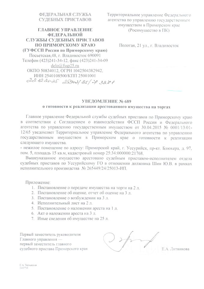 Нежилое помещение площадью 15 кв.м., кадастровый номер 25:34:000000:21768, расположенное по адресу: Приморский край, г. Уссурийск, пр-кт. Блюхера, д. 97, пом. 5, вид права - собственность, сведения о правах и ограничениях (обременениях): 43 записей о запрещении регистрации, прочие ограничения прав и обременения объекта недвижимости 2 записи, задолженность по взносам на кап.ремонт по состоянию на 18.02.2026 составляет 11144,55 руб.. а также пени в размере 3758,89 руб.