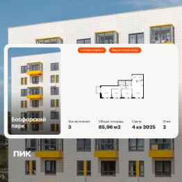 Продаётся 3-комн. квартира площадью 85,96 кв.м на 2 этаже 9 этажного дома (Корпус 8, Секция 1) проекта ПИК Босфорский парк. Светлый просторный подъезд на уровне земли, функциональная планировка, большие окна, c отделкой.