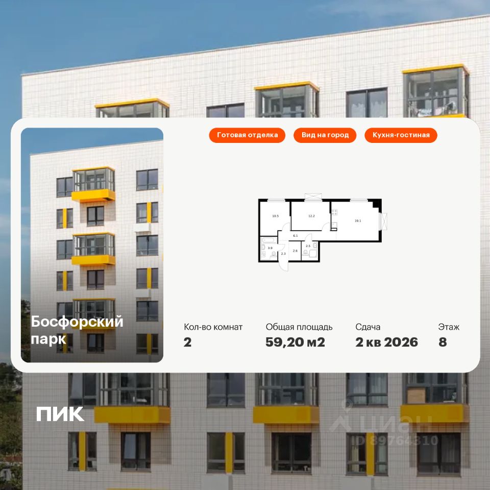 Продаётся 2-комн. квартира площадью 59,2 кв.м на 8 этаже 9 этажного дома (Корпус 4, Секция 1) проекта ПИК Босфорский парк. Светлый просторный подъезд на уровне земли, функциональная планировка, большие окна, c отделкой.