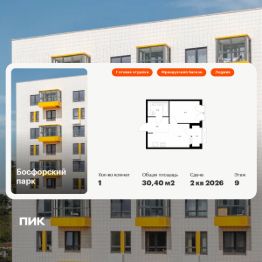 Продаётся 1-комн. квартира площадью 30,4 кв.м на 9 этаже 9 этажного дома (Корпус 4, Секция 1) проекта ПИК Босфорский парк. Светлый просторный подъезд на уровне земли, функциональная планировка, большие окна, c отделкой.