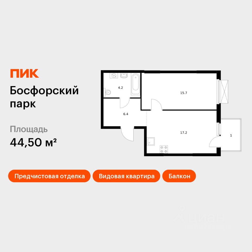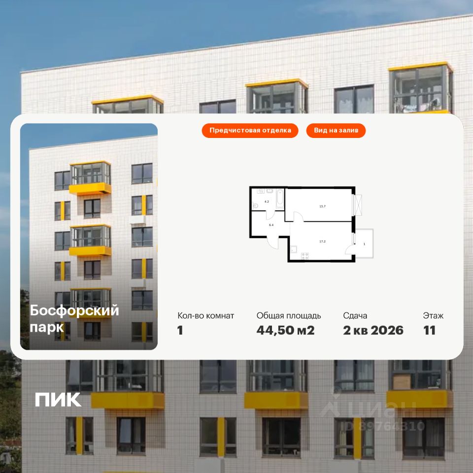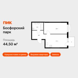 Продаётся 1-комн. квартира площадью 44,5 кв.м на 11 этаже 17 этажного дома (Корпус 5, Секция 1) проекта ПИК Босфорский парк. Светлый просторный подъезд на уровне земли, функциональная планировка, большие окна, предчистовая отделка.