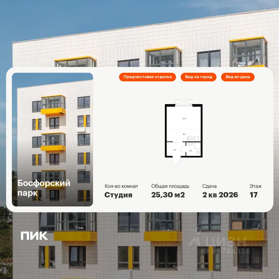 Продаётся квартира-студия площадью 25,3 кв.м на 17 этаже 17 этажного дома (Корпус 5, Секция 1) проекта ПИК Босфорский парк. Светлый просторный подъезд на уровне земли, функциональная планировка, большие окна, предчистовая отделка.