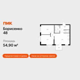Продаётся 2-комн. квартира площадью 54,9 кв.м на 9 этаже 17 этажного дома (Корпус 3, Секция 3) проекта ПИК Борисенко 48. Светлый просторный подъезд на уровне земли, функциональная планировка, большие окна, предчистовая отделка.