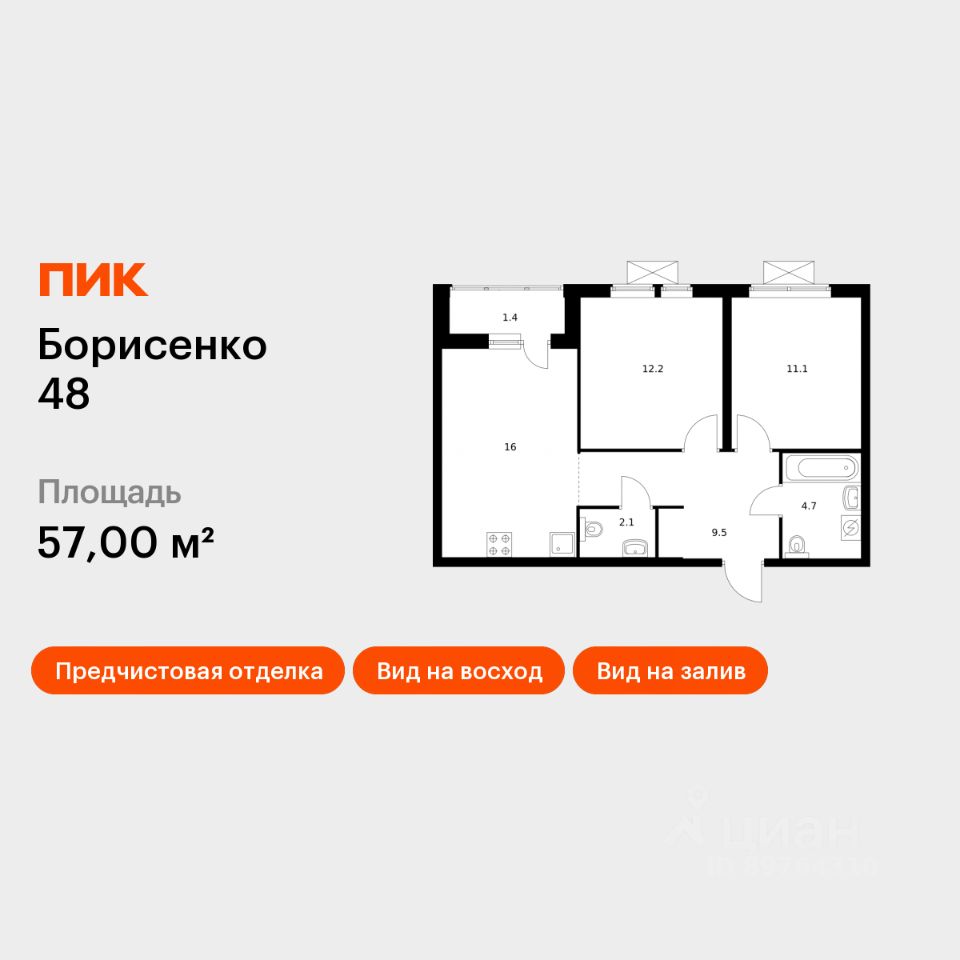 Продаётся 2-комн. квартира площадью 57 кв.м на 23 этаже 28 этажного дома (Корпус 2, Секция 2) проекта ПИК Борисенко 48. Светлый просторный подъезд на уровне земли, функциональная планировка, большие окна, предчистовая отделка.