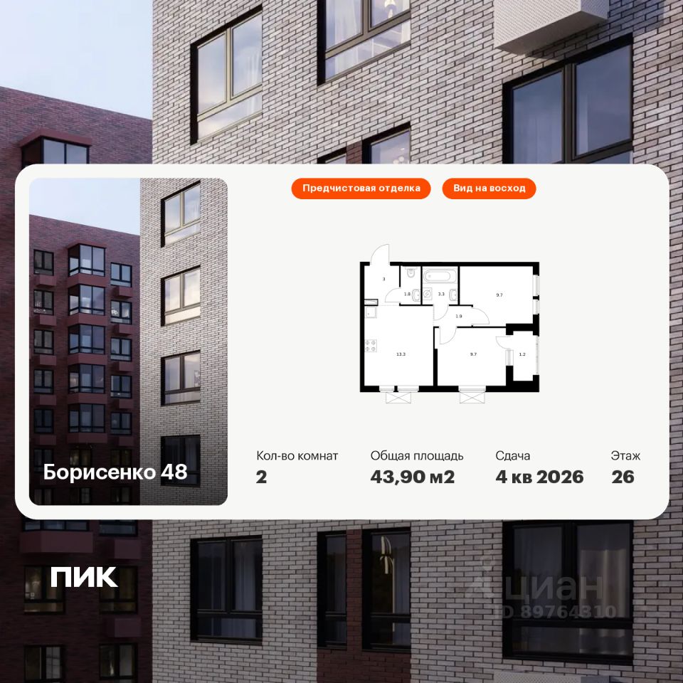 Продаётся 2-комн. квартира площадью 43,9 кв.м на 26 этаже 28 этажного дома (Корпус 2, Секция 2) проекта ПИК Борисенко 48. Светлый просторный подъезд на уровне земли, функциональная планировка, большие окна, предчистовая отделка.