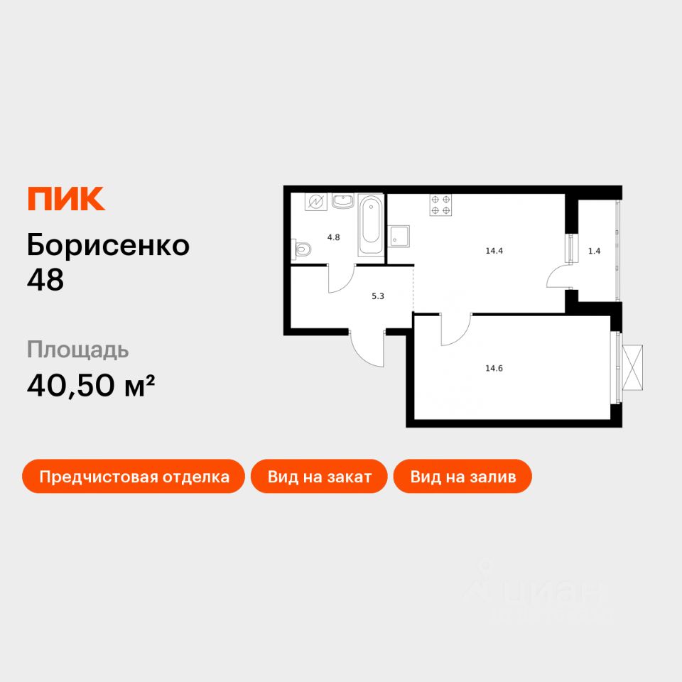 Продаётся 1-комн. квартира площадью 40,5 кв.м на 28 этаже 28 этажного дома (Корпус 2, Секция 2) проекта ПИК Борисенко 48. Светлый просторный подъезд на уровне земли, функциональная планировка, большие окна, предчистовая отделка.