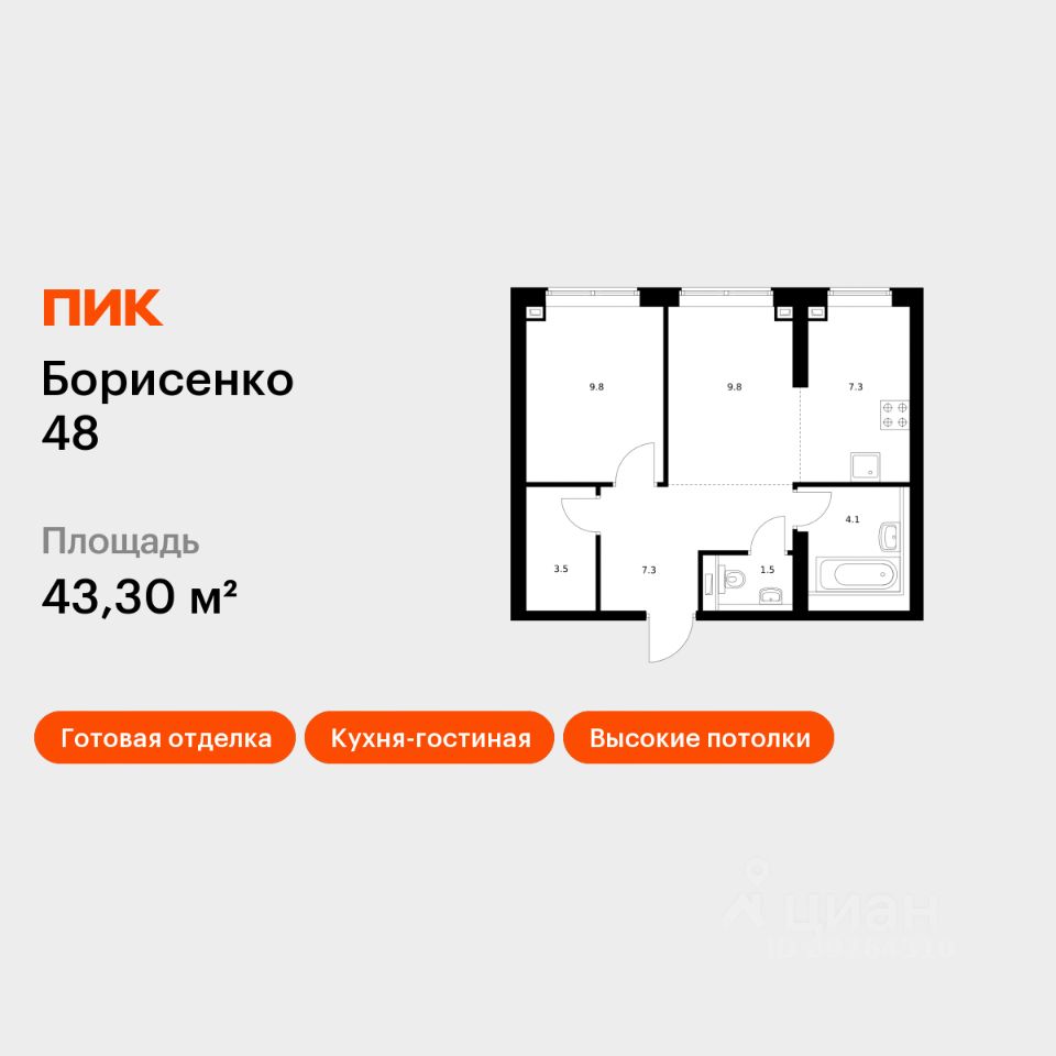 Продаётся 1-комн. квартира площадью 43,3 кв.м на 2 этаже 30 этажного дома (Корпус 4, Секция 4) проекта ПИК Борисенко 48. Светлый просторный подъезд на уровне земли, функциональная планировка, большие окна, c отделкой.