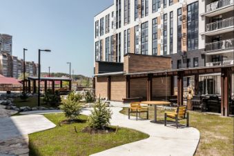 Комфортному пребыванию во дворе уделено также много внимания, как и проживанию в квартире. Детские и спортивные площадки, зоны отдыха располагаются как на стилобатной части между корпусами, так и на парковой территории рядом с комплексом. Проектом предусмотрено комплексное благоустройство и озеленение территории жилого комплекса.