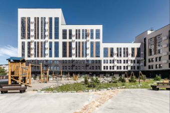 Комфортному пребыванию во дворе уделено также много внимания, как и проживанию в квартире. Детские и спортивные площадки, зоны отдыха располагаются как на стилобатной части между корпусами, так и на парковой территории рядом с комплексом. Проектом предусмотрено комплексное благоустройство и озеленение территории жилого комплекса.