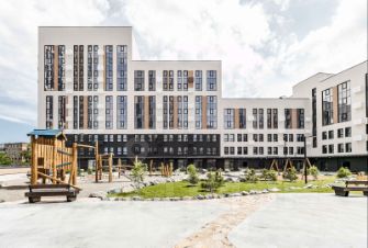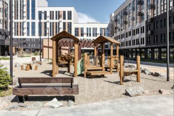 Комфортному пребыванию во дворе уделено также много внимания, как и проживанию в квартире. Детские и спортивные площадки, зоны отдыха располагаются как на стилобатной части между корпусами, так и на парковой территории рядом с комплексом. Проектом предусмотрено комплексное благоустройство и озеленение территории жилого комплекса.