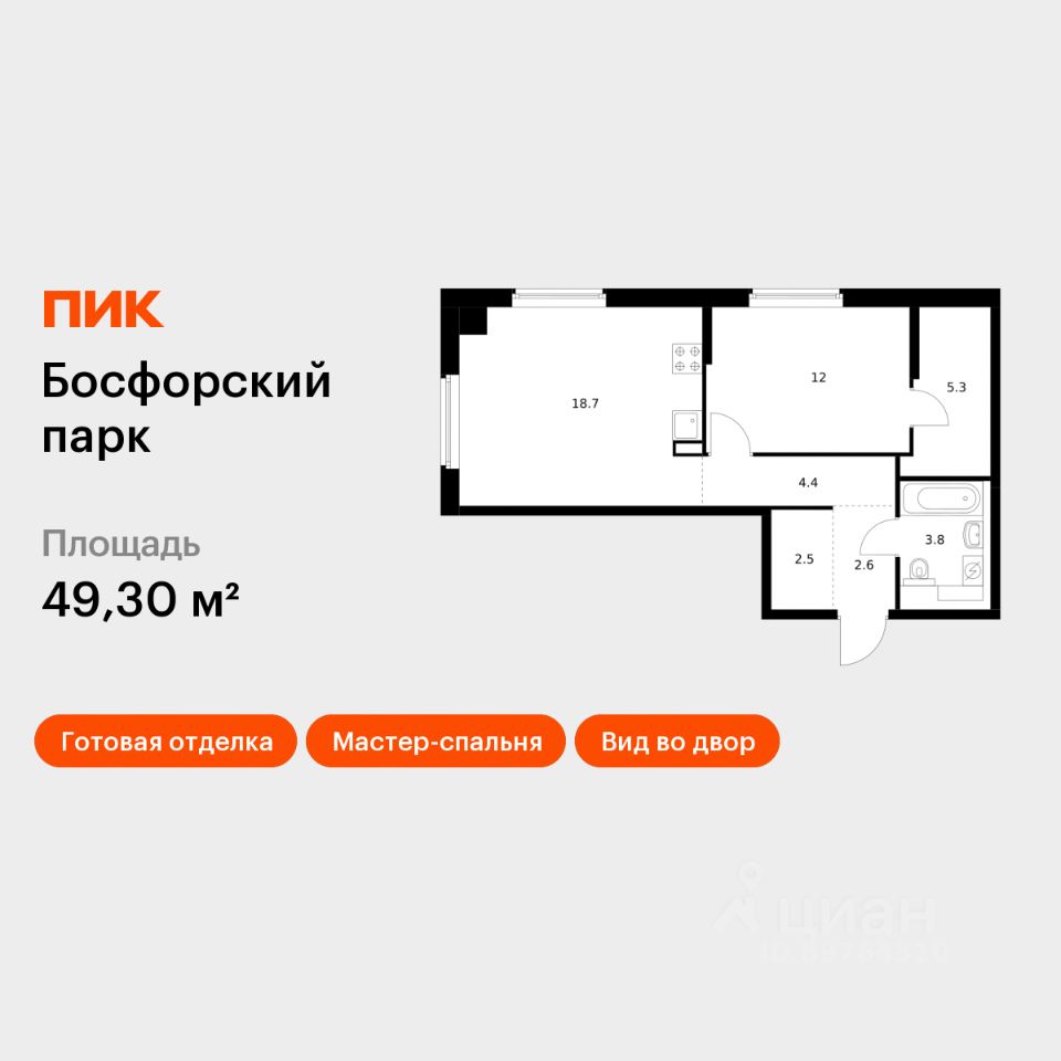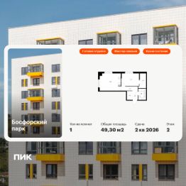Продаётся 1-комн. квартира площадью 49,3 кв.м на 2 этаже 9 этажного дома (Корпус 4, Секция 1) проекта ПИК Босфорский парк. Светлый просторный подъезд на уровне земли, функциональная планировка, большие окна, c отделкой.