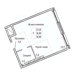 Продаётся 1-комнатная квартира в строящемся доме (Корпус 1), срок сдачи: II-кв. 2026, общей площадью 36.8 кв.м., на 23 этаже.