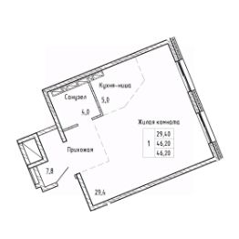 Продаётся 1-комнатная квартира в строящемся доме (Корпус 1), срок сдачи: II-кв. 2026, общей площадью 46.2 кв.м., на 23 этаже.