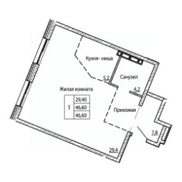 Продаётся 1-комнатная квартира в строящемся доме (Корпус 1), срок сдачи: II-кв. 2026, общей площадью 46.6 кв.м., на 7 этаже.