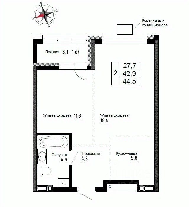 Общая площадь44,5 м²