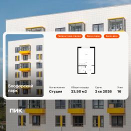 Продаётся квартира-студия площадью 23,5 кв.м на 16 этаже 17 этажного дома (Корпус 5, Секция 1) проекта ПИК Босфорский парк. Светлый просторный подъезд на уровне земли, функциональная планировка, большие окна, предчистовая отделка.