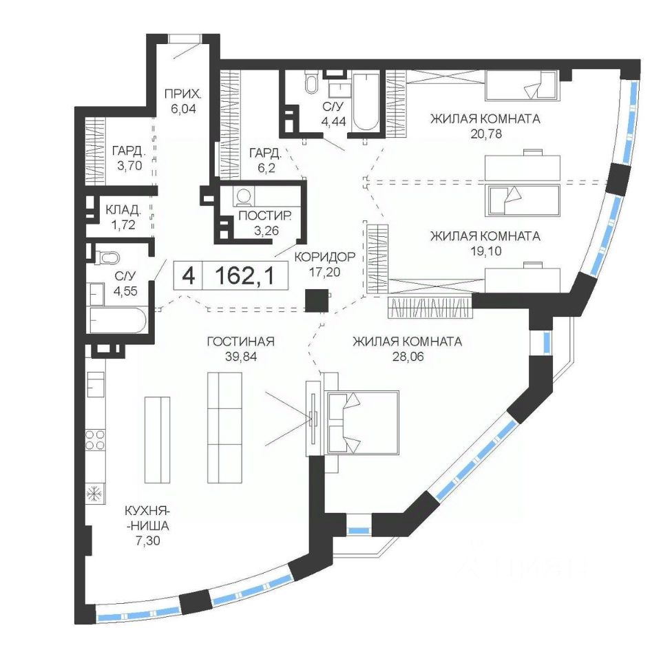 Продаётся 4-комнатная квартира в строящемся доме (Дом 1), срок сдачи: IV-кв. 2025, общей площадью 162.1 кв.м., на 5 этаже. ЖК представляет собой футуристический архитектурный ансамбль, состоящий из двух башен высотой 24 этажа и монументальной стилобатной части, на 5 этажах которой будут располагаться парковочная зона, а также современный торговый центр. Несмотря на слегка дерзкий вид башен, стремительно взмывающих вверх, они прекрасным образом гармонируют с окружающим пространством: солнечные лучи, играющие на зеркальной поверхности фасада, и отражающиеся на ней облака создают фантастический пространственный эффект! Высота наземной части зданий составляет 75 м., общая площадь насчитывает около 40 000 кв. м. - всё это 399 апартаментов свободной планировки, площадью от 97 до 200 кв. м. 192 апартамента.