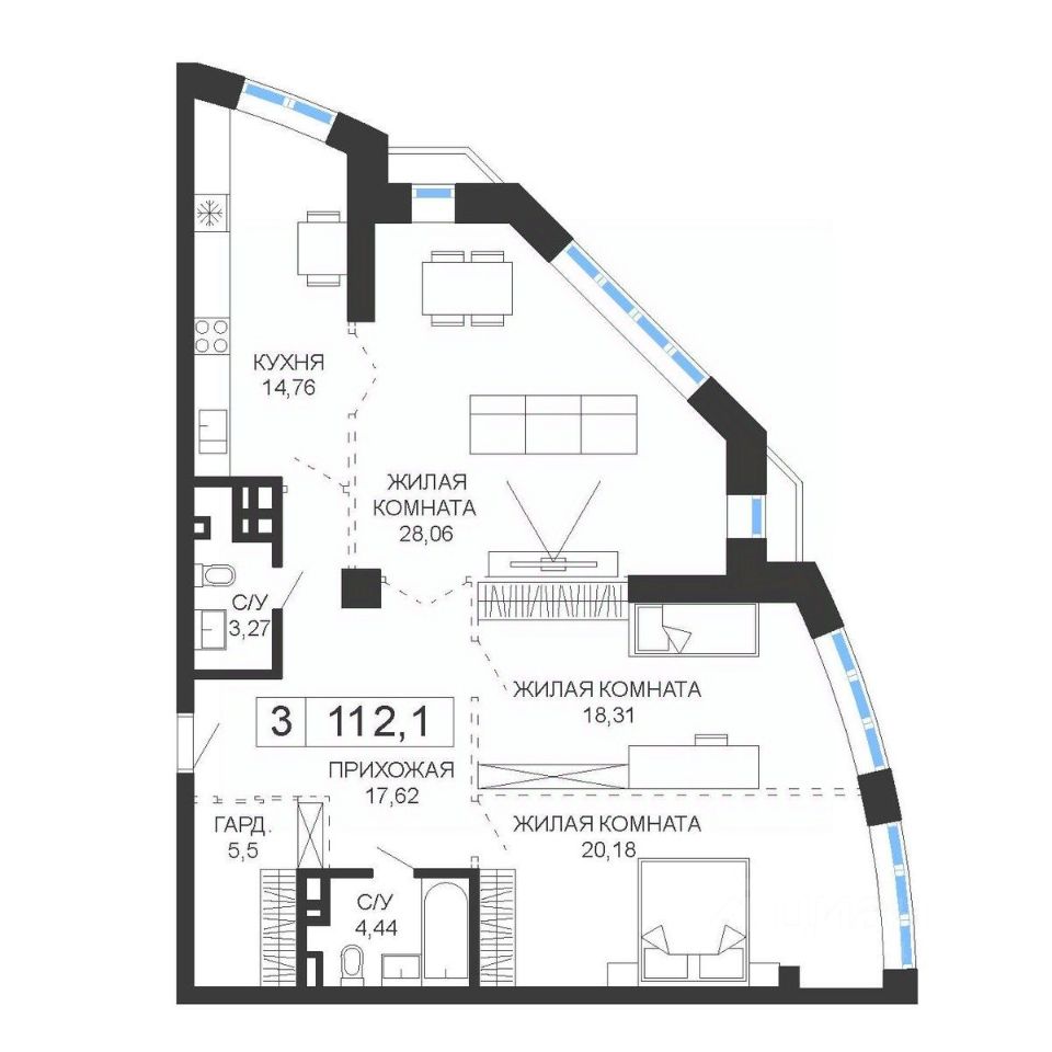 Продаётся 3-комнатная квартира в строящемся доме (Дом 1), срок сдачи: IV-кв. 2025, общей площадью 112.1 кв.м., на 6 этаже. ЖК представляет собой футуристический архитектурный ансамбль, состоящий из двух башен высотой 24 этажа и монументальной стилобатной части, на 5 этажах которой будут располагаться парковочная зона, а также современный торговый центр. Несмотря на слегка дерзкий вид башен, стремительно взмывающих вверх, они прекрасным образом гармонируют с окружающим пространством: солнечные лучи, играющие на зеркальной поверхности фасада, и отражающиеся на ней облака создают фантастический пространственный эффект! Высота наземной части зданий составляет 75 м., общая площадь насчитывает около 40 000 кв. м. - всё это 399 апартаментов свободной планировки, площадью от 97 до 200 кв. м. 192 апартамента.