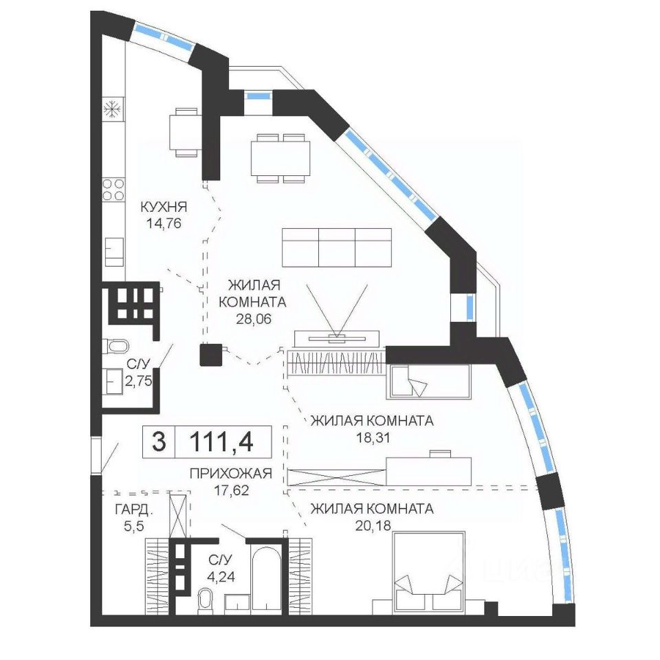 Продаётся 3-комнатная квартира в строящемся доме (Дом 1), срок сдачи: IV-кв. 2025, общей площадью 111.4 кв.м., на 15 этаже. ЖК представляет собой футуристический архитектурный ансамбль, состоящий из двух башен высотой 24 этажа и монументальной стилобатной части, на 5 этажах которой будут располагаться парковочная зона, а также современный торговый центр. Несмотря на слегка дерзкий вид башен, стремительно взмывающих вверх, они прекрасным образом гармонируют с окружающим пространством: солнечные лучи, играющие на зеркальной поверхности фасада, и отражающиеся на ней облака создают фантастический пространственный эффект! Высота наземной части зданий составляет 75 м., общая площадь насчитывает около 40 000 кв. м. - всё это 399 апартаментов свободной планировки, площадью от 97 до 200 кв. м. 192 апартамента.