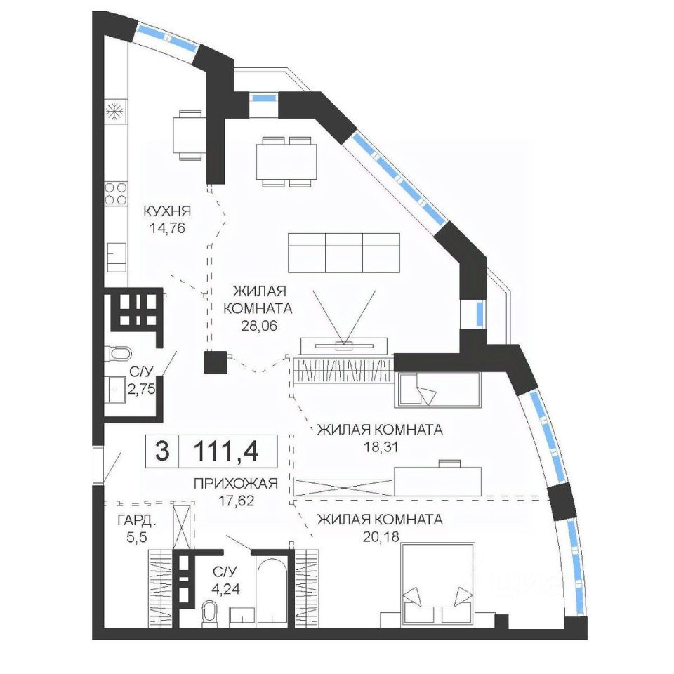 Продаётся 3-комнатная квартира в строящемся доме (Дом 1), срок сдачи: IV-кв. 2025, общей площадью 111.4 кв.м., на 18 этаже. ЖК представляет собой футуристический архитектурный ансамбль, состоящий из двух башен высотой 24 этажа и монументальной стилобатной части, на 5 этажах которой будут располагаться парковочная зона, а также современный торговый центр. Несмотря на слегка дерзкий вид башен, стремительно взмывающих вверх, они прекрасным образом гармонируют с окружающим пространством: солнечные лучи, играющие на зеркальной поверхности фасада, и отражающиеся на ней облака создают фантастический пространственный эффект! Высота наземной части зданий составляет 75 м., общая площадь насчитывает около 40 000 кв. м. - всё это 399 апартаментов свободной планировки, площадью от 97 до 200 кв. м. 192 апартамента.