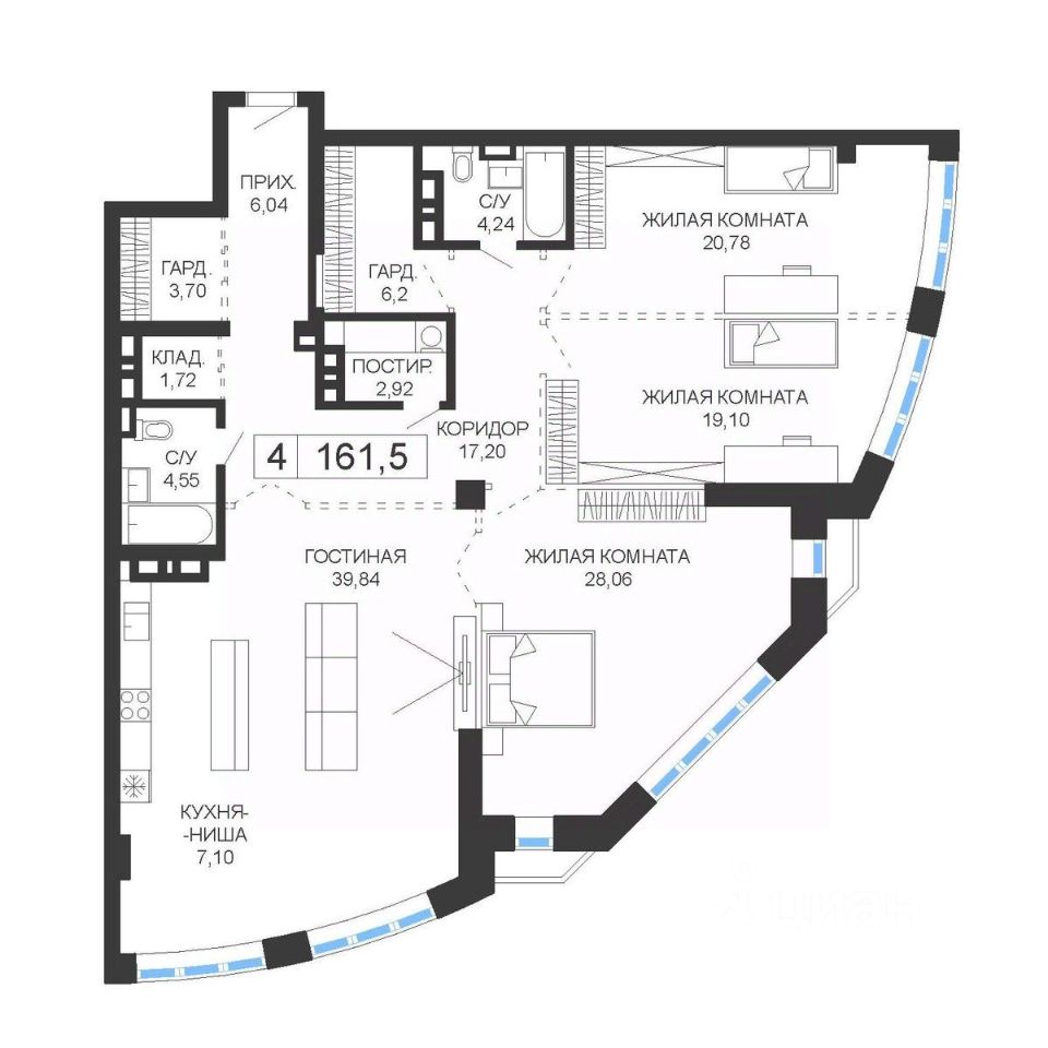 Продаётся 4-комнатная квартира в строящемся доме (Дом 1), срок сдачи: IV-кв. 2025, общей площадью 161.5 кв.м., на 22 этаже. ЖК представляет собой футуристический архитектурный ансамбль, состоящий из двух башен высотой 24 этажа и монументальной стилобатной части, на 5 этажах которой будут располагаться парковочная зона, а также современный торговый центр. Несмотря на слегка дерзкий вид башен, стремительно взмывающих вверх, они прекрасным образом гармонируют с окружающим пространством: солнечные лучи, играющие на зеркальной поверхности фасада, и отражающиеся на ней облака создают фантастический пространственный эффект! Высота наземной части зданий составляет 75 м., общая площадь насчитывает около 40 000 кв. м. - всё это 399 апартаментов свободной планировки, площадью от 97 до 200 кв. м. 192 апартамента.