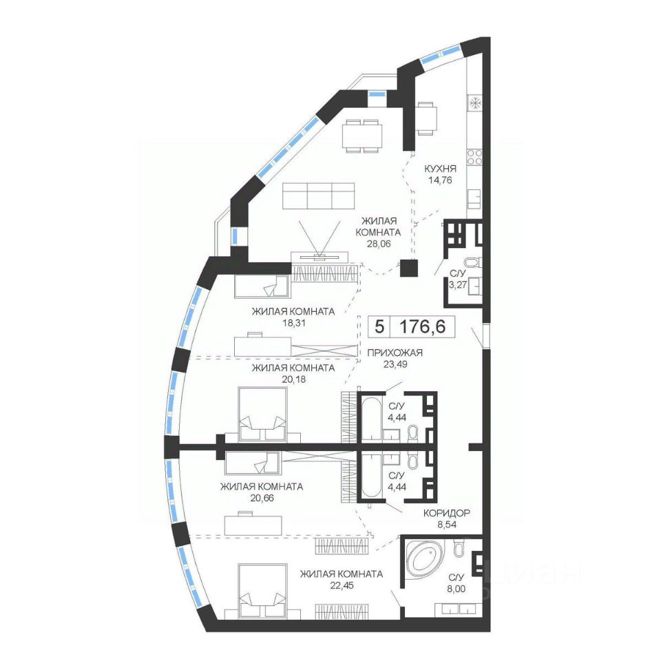 Продаётся 5-комнатная квартира в строящемся доме (Дом 1), срок сдачи: IV-кв. 2025, общей площадью 176.6 кв.м., на 5 этаже. ЖК представляет собой футуристический архитектурный ансамбль, состоящий из двух башен высотой 24 этажа и монументальной стилобатной части, на 5 этажах которой будут располагаться парковочная зона, а также современный торговый центр. Несмотря на слегка дерзкий вид башен, стремительно взмывающих вверх, они прекрасным образом гармонируют с окружающим пространством: солнечные лучи, играющие на зеркальной поверхности фасада, и отражающиеся на ней облака создают фантастический пространственный эффект! Высота наземной части зданий составляет 75 м., общая площадь насчитывает около 40 000 кв. м. - всё это 399 апартаментов свободной планировки, площадью от 97 до 200 кв. м. 192 апартамента.