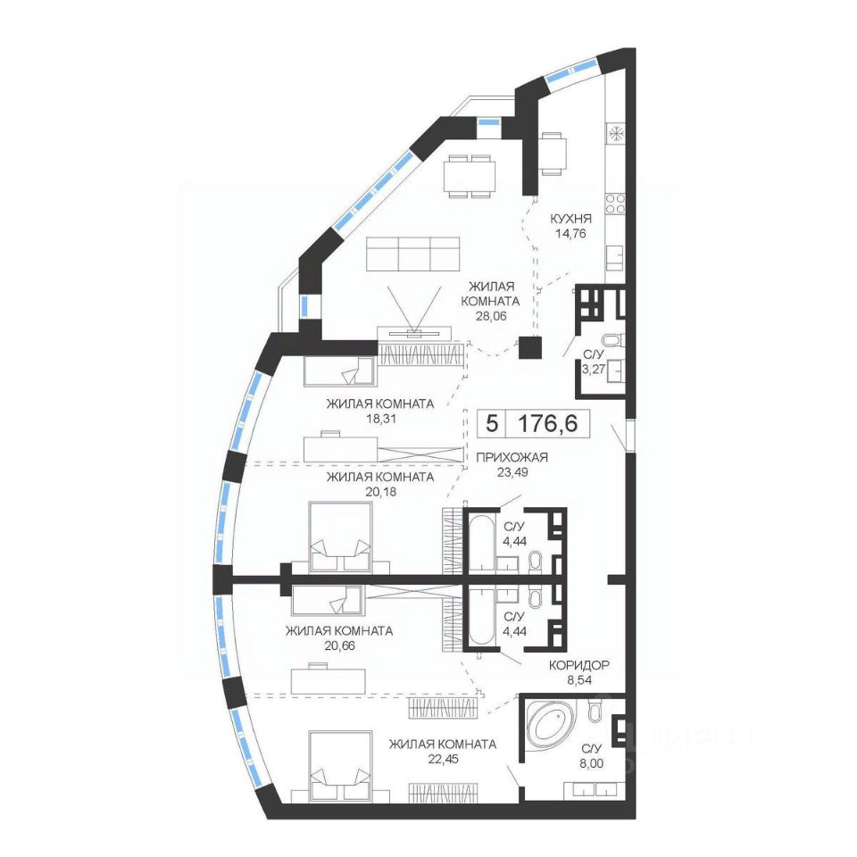 Продаётся 5-комнатная квартира в строящемся доме (Дом 1), срок сдачи: IV-кв. 2025, общей площадью 176.6 кв.м., на 13 этаже. ЖК представляет собой футуристический архитектурный ансамбль, состоящий из двух башен высотой 24 этажа и монументальной стилобатной части, на 5 этажах которой будут располагаться парковочная зона, а также современный торговый центр. Несмотря на слегка дерзкий вид башен, стремительно взмывающих вверх, они прекрасным образом гармонируют с окружающим пространством: солнечные лучи, играющие на зеркальной поверхности фасада, и отражающиеся на ней облака создают фантастический пространственный эффект! Высота наземной части зданий составляет 75 м., общая площадь насчитывает около 40 000 кв. м. - всё это 399 апартаментов свободной планировки, площадью от 97 до 200 кв. м. 192 апартамента.
