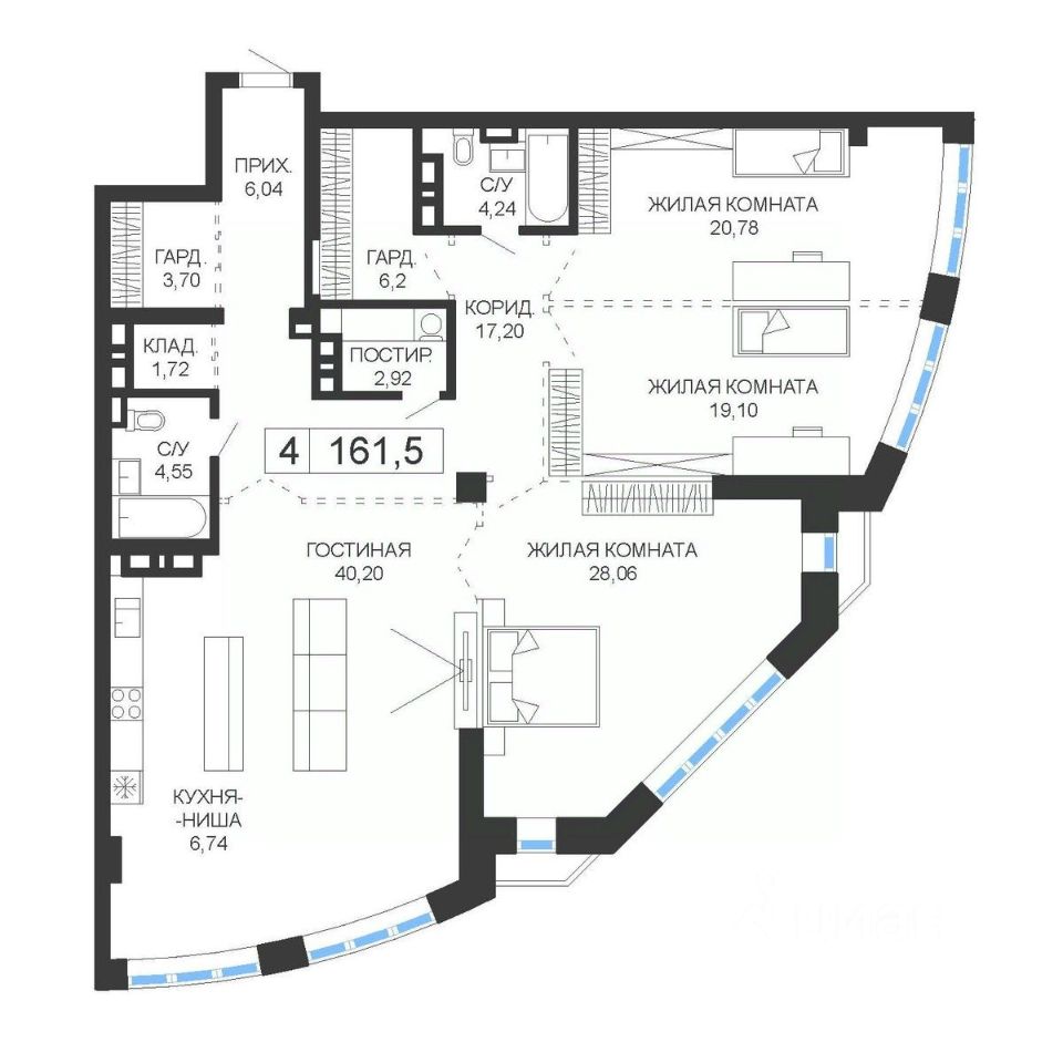 Продаётся 4-комнатная квартира в строящемся доме (Дом 1), срок сдачи: IV-кв. 2025, общей площадью 161.5 кв.м., на 15 этаже. ЖК представляет собой футуристический архитектурный ансамбль, состоящий из двух башен высотой 24 этажа и монументальной стилобатной части, на 5 этажах которой будут располагаться парковочная зона, а также современный торговый центр. Несмотря на слегка дерзкий вид башен, стремительно взмывающих вверх, они прекрасным образом гармонируют с окружающим пространством: солнечные лучи, играющие на зеркальной поверхности фасада, и отражающиеся на ней облака создают фантастический пространственный эффект! Высота наземной части зданий составляет 75 м., общая площадь насчитывает около 40 000 кв. м. - всё это 399 апартаментов свободной планировки, площадью от 97 до 200 кв. м. 192 апартамента.