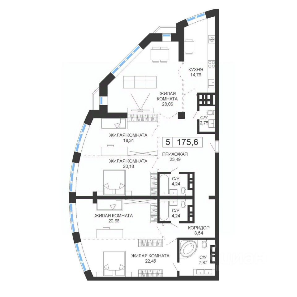 Продаётся 5-комнатная квартира в строящемся доме (Дом 1), срок сдачи: IV-кв. 2025, общей площадью 175.6 кв.м., на 17 этаже. ЖК представляет собой футуристический архитектурный ансамбль, состоящий из двух башен высотой 24 этажа и монументальной стилобатной части, на 5 этажах которой будут располагаться парковочная зона, а также современный торговый центр. Несмотря на слегка дерзкий вид башен, стремительно взмывающих вверх, они прекрасным образом гармонируют с окружающим пространством: солнечные лучи, играющие на зеркальной поверхности фасада, и отражающиеся на ней облака создают фантастический пространственный эффект! Высота наземной части зданий составляет 75 м., общая площадь насчитывает около 40 000 кв. м. - всё это 399 апартаментов свободной планировки, площадью от 97 до 200 кв. м. 192 апартамента.