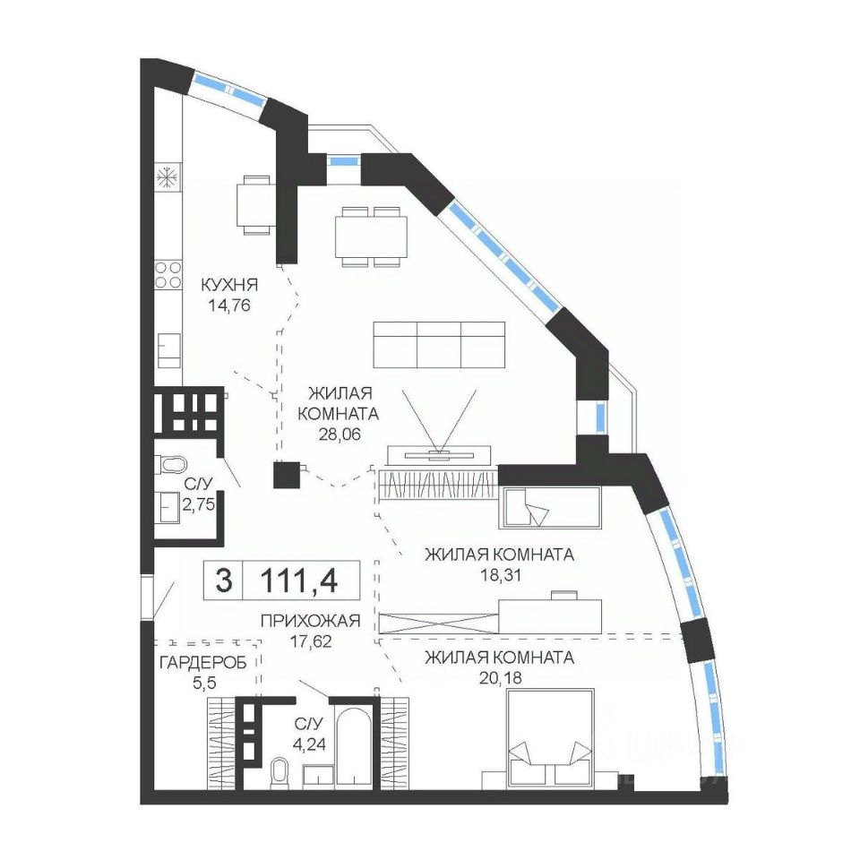 Продаётся 3-комнатная квартира в строящемся доме (Дом 1), срок сдачи: IV-кв. 2025, общей площадью 111.4 кв.м., на 17 этаже. ЖК представляет собой футуристический архитектурный ансамбль, состоящий из двух башен высотой 24 этажа и монументальной стилобатной части, на 5 этажах которой будут располагаться парковочная зона, а также современный торговый центр. Несмотря на слегка дерзкий вид башен, стремительно взмывающих вверх, они прекрасным образом гармонируют с окружающим пространством: солнечные лучи, играющие на зеркальной поверхности фасада, и отражающиеся на ней облака создают фантастический пространственный эффект! Высота наземной части зданий составляет 75 м., общая площадь насчитывает около 40 000 кв. м. - всё это 399 апартаментов свободной планировки, площадью от 97 до 200 кв. м. 192 апартамента.