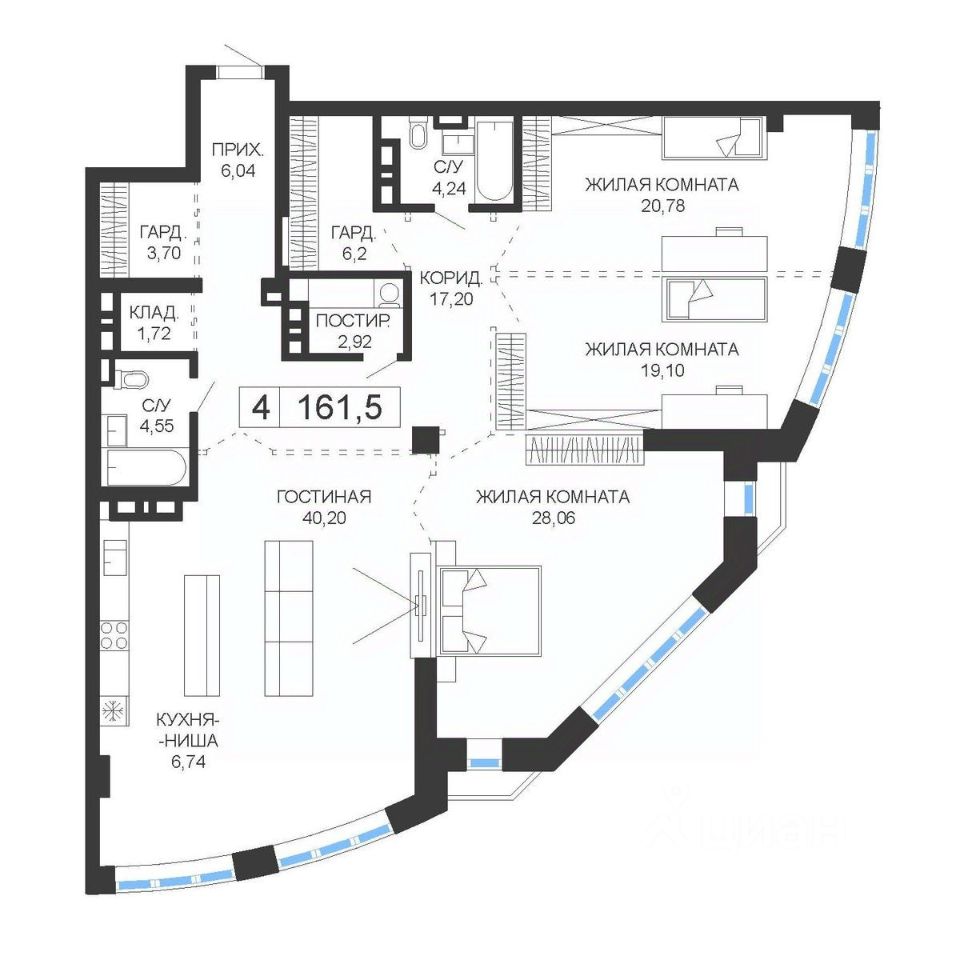 Продаётся 4-комнатная квартира в строящемся доме (Дом 1), срок сдачи: IV-кв. 2025, общей площадью 161.5 кв.м., на 21 этаже. ЖК представляет собой футуристический архитектурный ансамбль, состоящий из двух башен высотой 24 этажа и монументальной стилобатной части, на 5 этажах которой будут располагаться парковочная зона, а также современный торговый центр. Несмотря на слегка дерзкий вид башен, стремительно взмывающих вверх, они прекрасным образом гармонируют с окружающим пространством: солнечные лучи, играющие на зеркальной поверхности фасада, и отражающиеся на ней облака создают фантастический пространственный эффект! Высота наземной части зданий составляет 75 м., общая площадь насчитывает около 40 000 кв. м. - всё это 399 апартаментов свободной планировки, площадью от 97 до 200 кв. м. 192 апартамента.