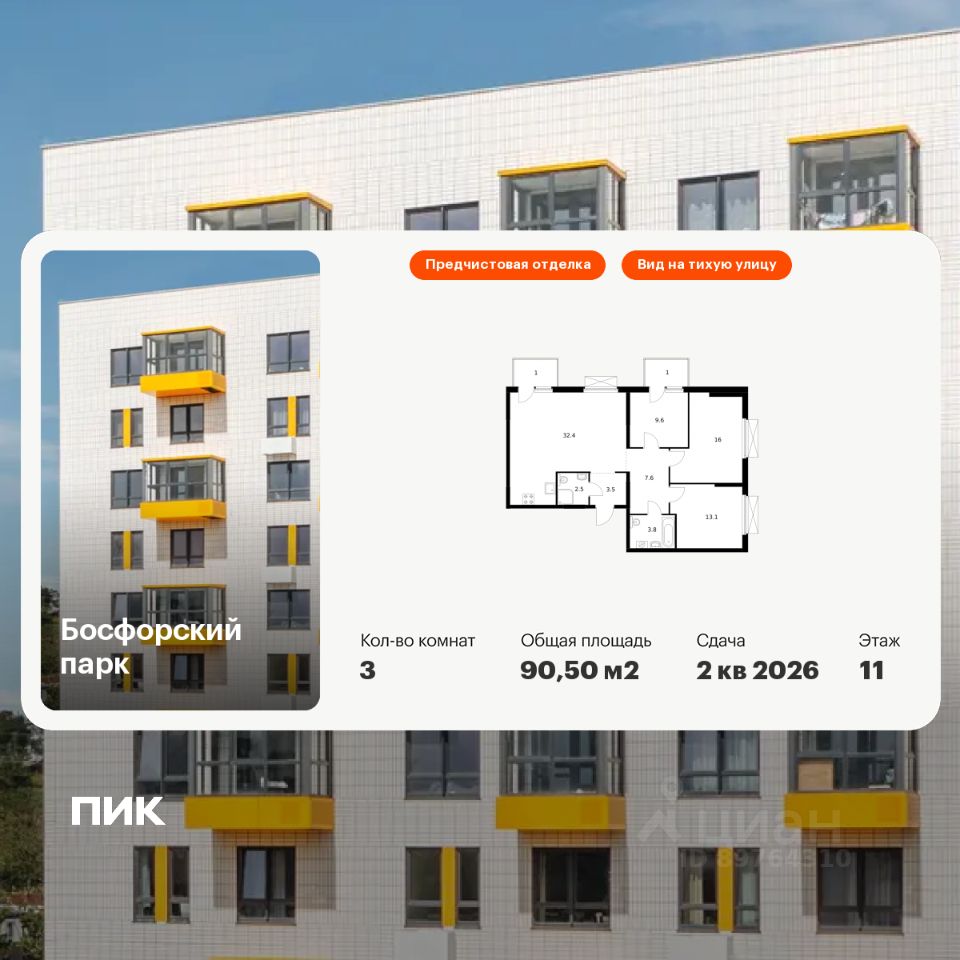 Продаётся 3-комн. квартира площадью 90,5 кв.м на 11 этаже 17 этажного дома (Корпус 5, Секция 1) проекта ПИК Босфорский парк. Светлый просторный подъезд на уровне земли, функциональная планировка, большие окна, предчистовая отделка.