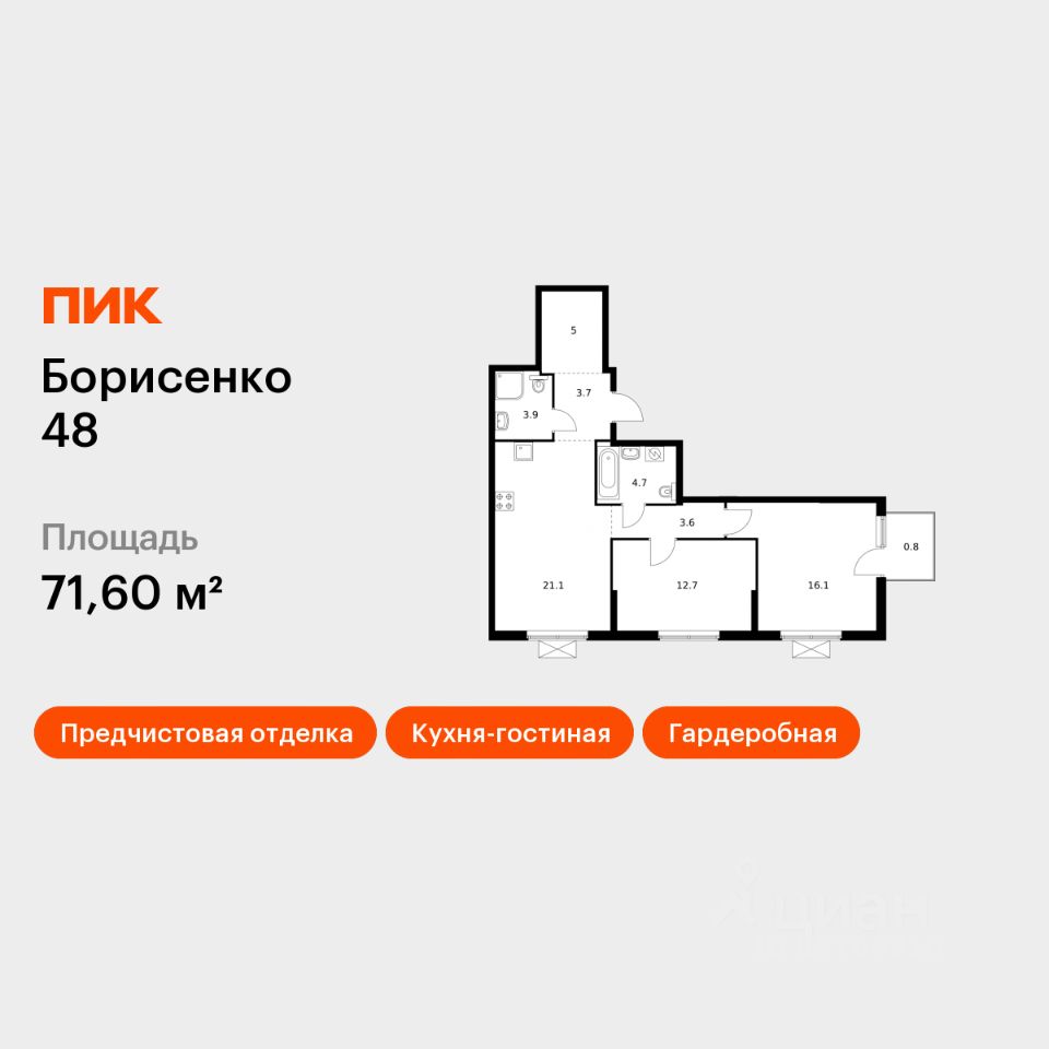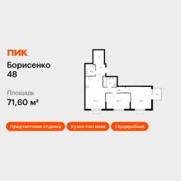 Продаётся 2-комн. квартира площадью 71,6 кв.м на 17 этаже 17 этажного дома (Корпус 3, Секция 3) проекта ПИК Борисенко 48. Светлый просторный подъезд на уровне земли, функциональная планировка, большие окна, предчистовая отделка.