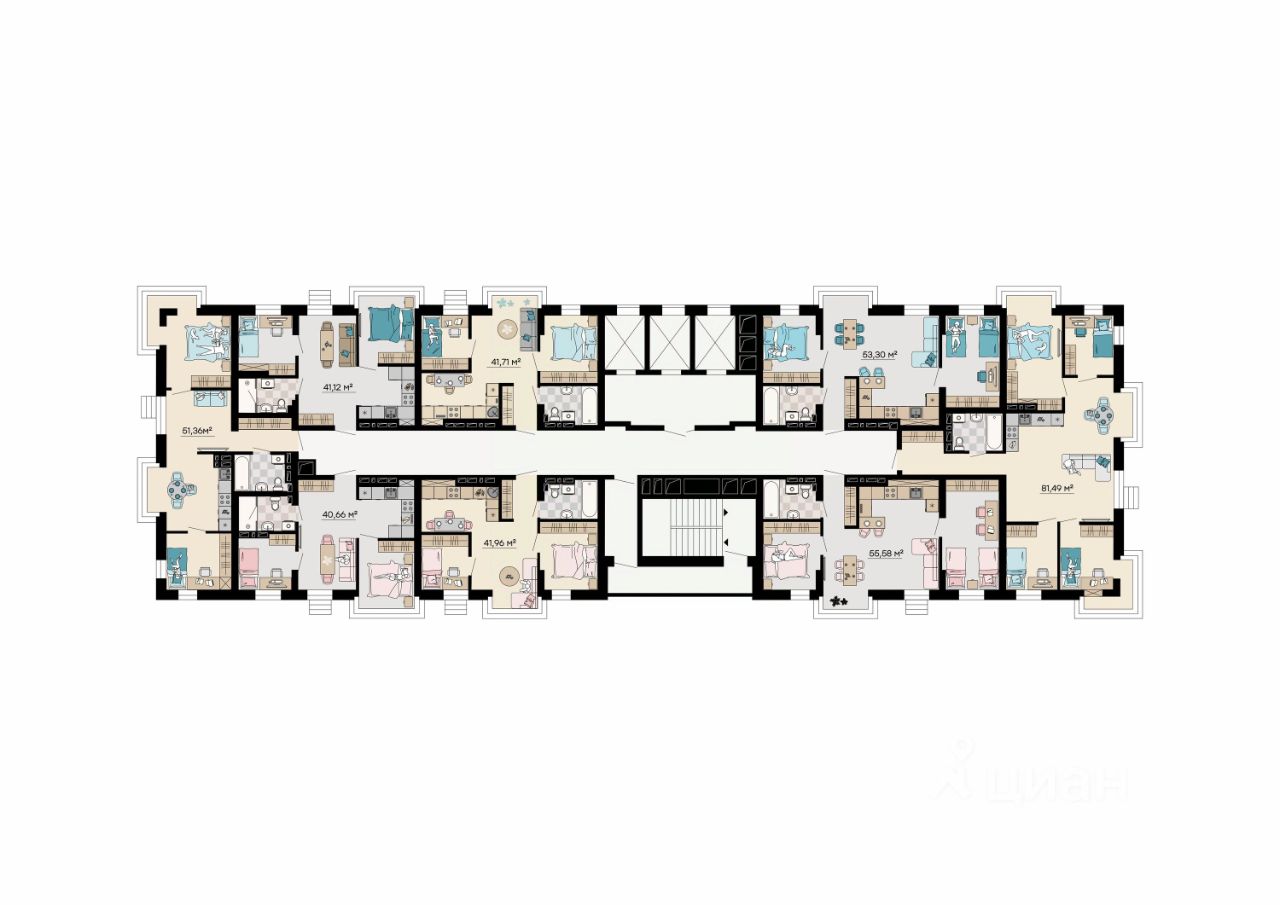 Широкоформатные квартиры свободной планировки формата Smart-vision площадью от 39,56 кв. м до 81,9 кв. м позволяют реализовать любые планировочные решения, а эркерные окна увеличенного размера открывают головокружительный вид на Амурский залив, низководный мост и завораживающий лесной массив. Проектом предусмотрены широкие коридоры мест общего пользования 2,4 м, просторный лифтовой холл площадью 37 кв. м и вестибюль 15,68 кв. м.