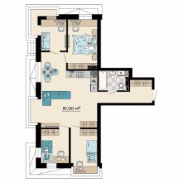 Широкоформатные квартиры свободной планировки формата Smart-vision площадью от 39,56 кв. м до 81,9 кв. м позволяют реализовать любые планировочные решения, а эркерные окна увеличенного размера открывают головокружительный вид на Амурский залив, низководный мост и завораживающий лесной массив. Проектом предусмотрены широкие коридоры мест общего пользования 2,4 м, просторный лифтовой холл площадью 37 кв. м и вестибюль 15,68 кв. м.