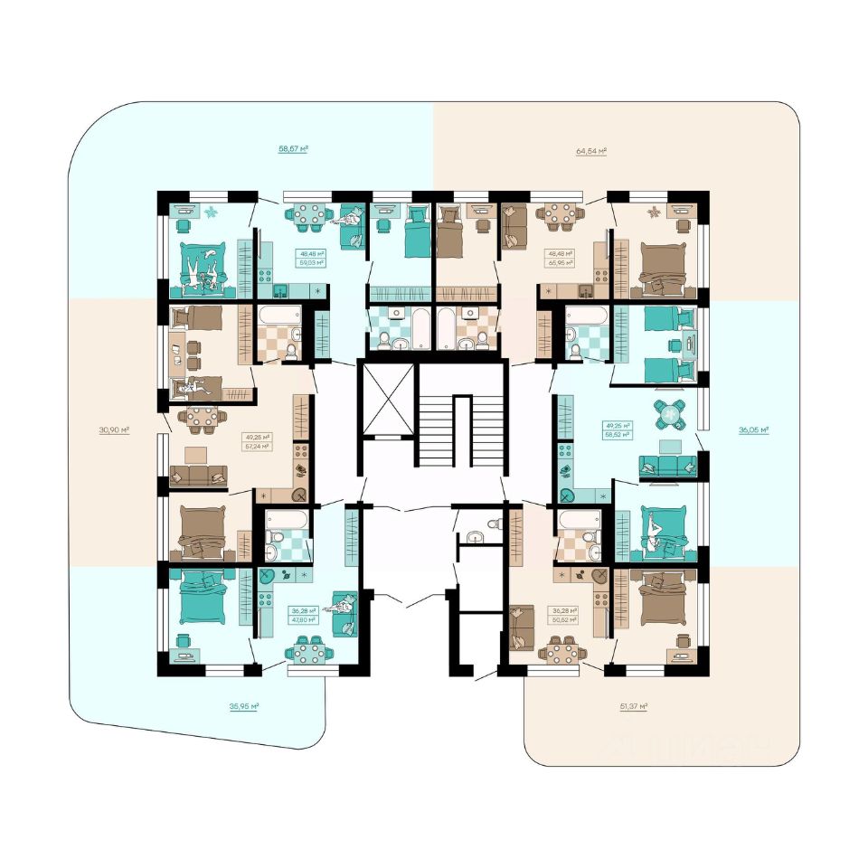 Квартиры формата Smart Comfort + (смарт комфорт +) площадью от 32 кв. м до 136 кв. м предоставляют свободу в реализации планировочных решений, а высота потолков 2,7 м с увеличенными панорамными окнами 2,45 м обеспечивают высокий уровень естественного освещения и открывают завораживающий обзор на лесной массив загородной местности.